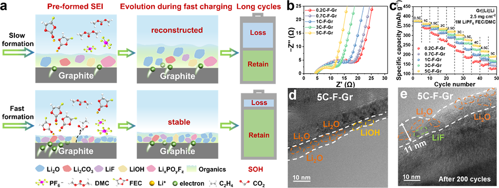 图 (a) 电流密度衍生界面演变规律示意图;(b)界面离子传输阻抗;(c)不同化成制度下电极倍率性能;(d)快速化成界面结构;(e)快速化成界面演变结构。