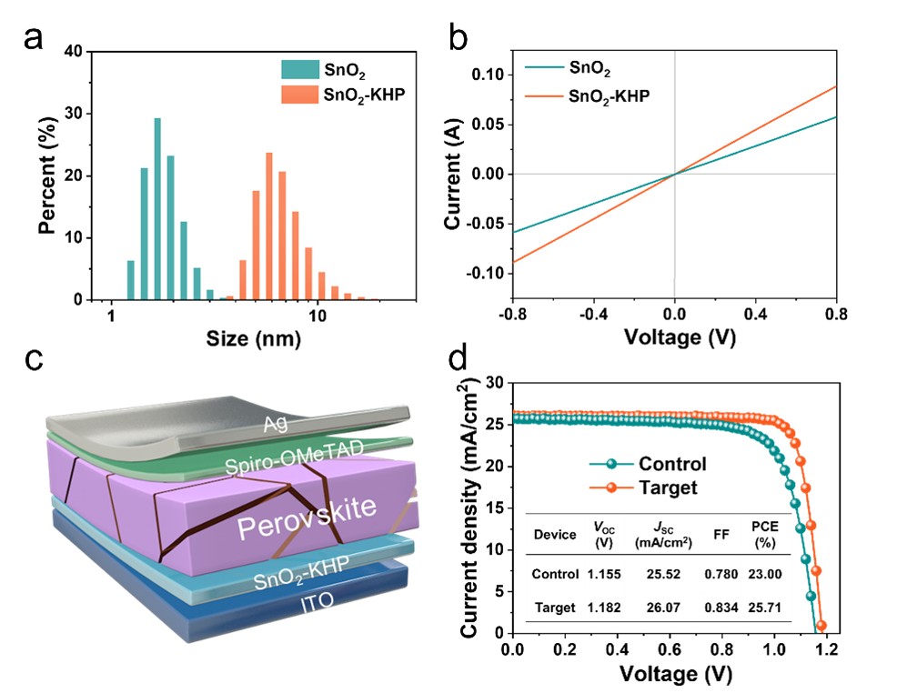 (a) sno2和sno2- khp胶体的dls图;(b) ito/sno2和sno2- khp /ag结构器件的暗态i-v特性曲线;(c-d)钙钛矿太阳能电池效率图